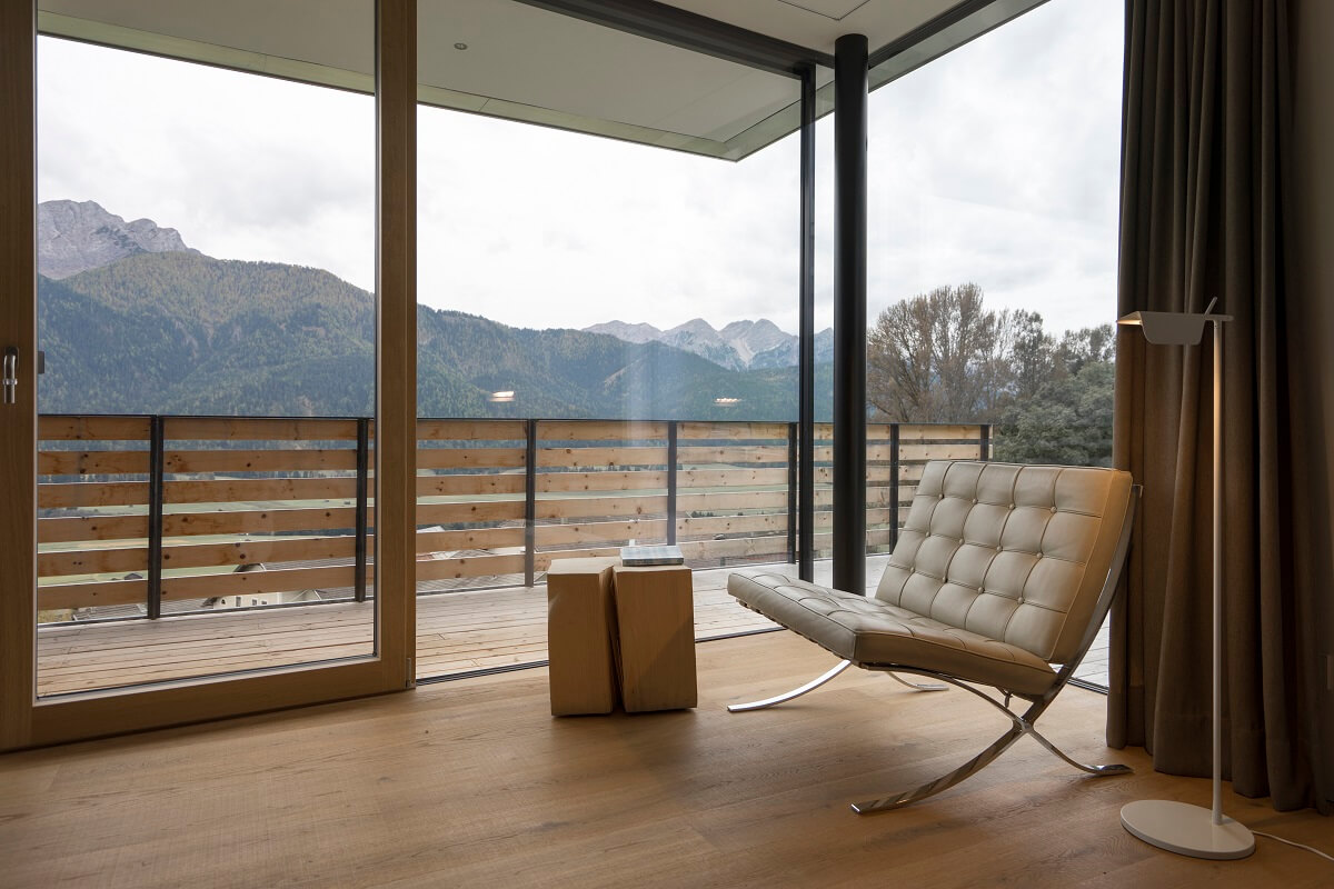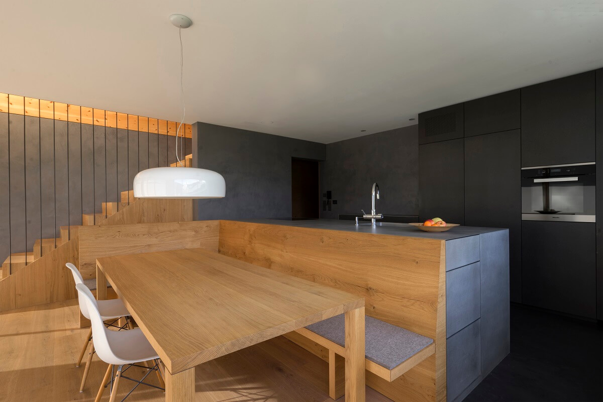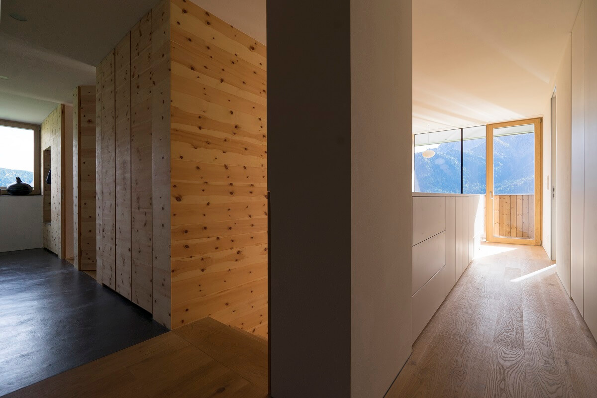 Auch im Innenraum wurde mit einer sehr reduzierten Materialpalette gearbeitet. Zirbe und Eiche schaffen einen Kontrast zwischen hell und dunkel. Das weiche Holz der Zirbe wurde für vertikale Flächen verwendet, während die strapazierfähige Eiche für Bodenflächen und hochbeanspruchte Möbelteile eingesetzt wurde.