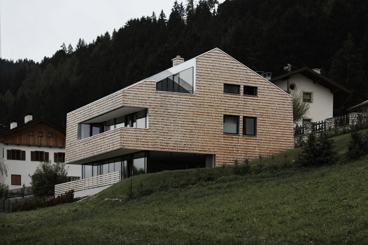 Die Materialwahl folgt der Philosophie der Reduktion, welche sich wie ein roter Faden durch das Projekt zieht. Die gesamte Gebäudehülle, Außenwände und Dach, wurde mit Schindeln aus Zedernholz eingedeckt. Das Zedernholz ist anfänglich perlfarben und erhält über die Zeit eine gleichmäßig hellgraue Färbung und erweist sich als äußerst resistent gegenüber Witterungseinflüssen.